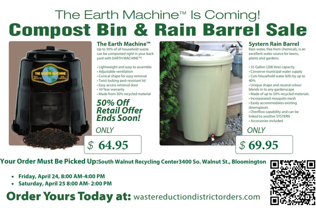 In honor of Earth Day April 22nd, the Waste Reduction District, and the City of Bloomington are offering discounted compost bins and rain barrels.